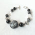 - Created with Larvikite, Black Tourmaline and Crystal Quartz beads along with lotus flower silver pewter accents. They're strung on heavy gauge nylon coated stainless steel wire with a pewter toggle closure.